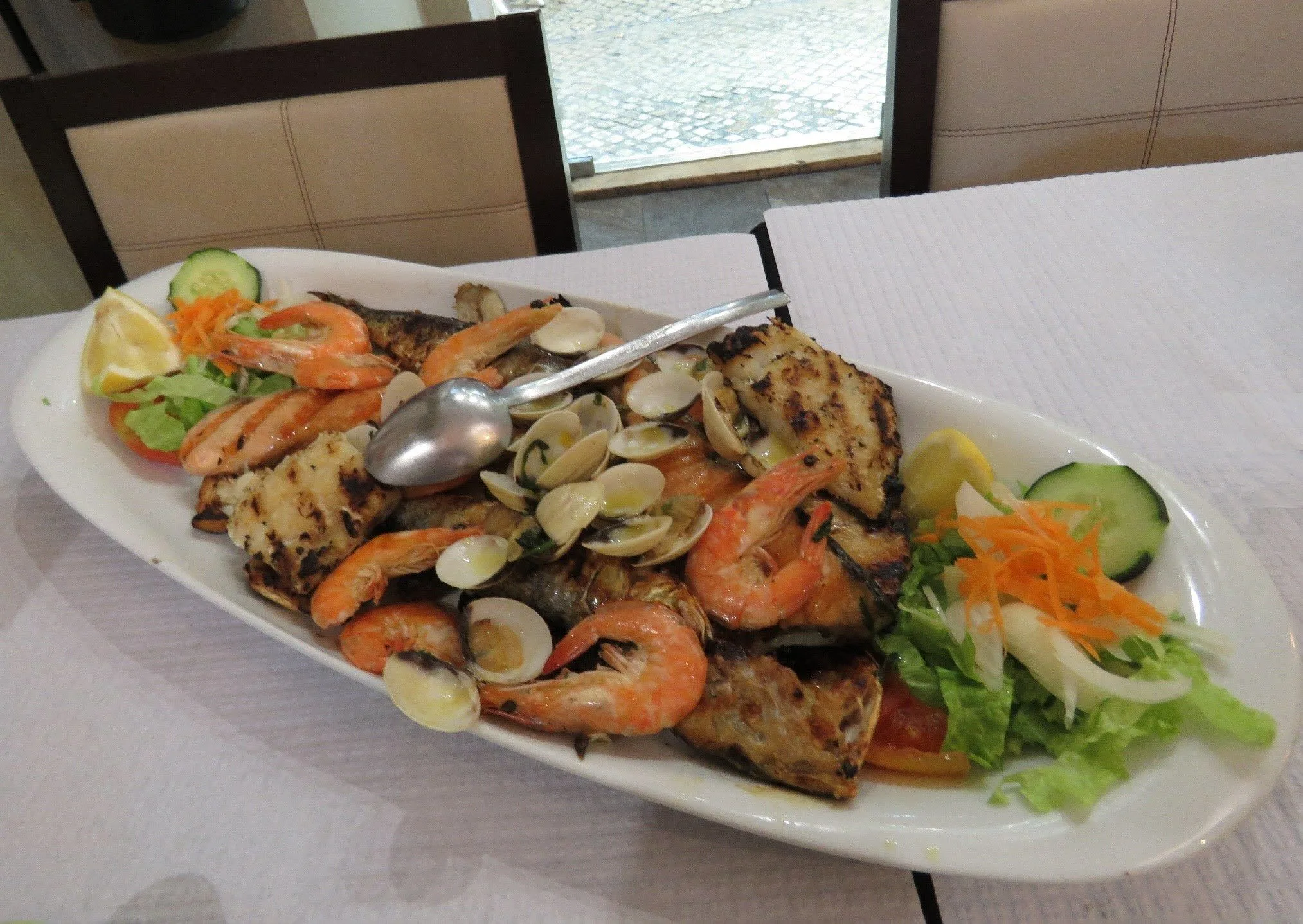 intr-un mic restaurant din apropiere, unde am savurat un urias platou cu cod (bacalhau), somon (salmão), sardine (sardinhas), scoici (conchas), creveti (camarões) precum si vin alb la pahar. Aperitivele care ne-au fost puse la inceput in fata stiam din relatarile de pe internet ca sunt contra cost, insa am dorit sa le incercam. Nu ne-au impresionat nici branzeturile si nici pasta de peste (ton respectiv sardine), asa ca ne-am inecat amarul intr-un pahar cu vin de Porto, oferit din partea casei. In drumul de intoarcere catre hotel am remarcat intre Praça do Comércio si Praça Dom Pedro IV liftul Santa Justa (elevador de Santa Justa) avand 13 m inaltime, un prim punct panoramic al orasului pe care nu am dorit sa-l incercam, anticipand ca alternativele din cartierele Bairro Alto si Alfama vor fi mult mai spectaculoase. Pentru cei interesati, taxa pentru o calatorie dus intors si accesul la punctul panoramic este de 5 euro.